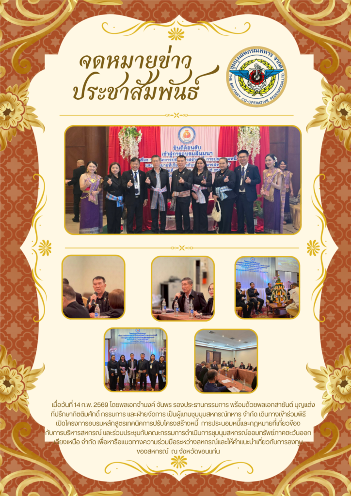 เมื่อวันที่ 14 ก.พ. 2569 โดยพลเอกจำนงค์ จันพร รองประธานกรรมการ พร้อมด้วยพลเอกสายันต์ บุญแต่ง ที่ปรึกษากิตติมศักดิ์ กรรมการ และฝ่ายจัดการ เป็นผู้แทนชุมนุมสหกรณ์ทหาร จำกัด เข้าร่วมกิจกรรมภาคีเครือข่ายกับชุมนุมสหกรณ์ออมทรัพย์ภาคตะวันออกเฉียงเหนือ จำกัด ณ จังหวัดขอนแก่น ตามแผนงานของชุมนุมสหกรณ์ทหาร ในปีบัญชี 2569
